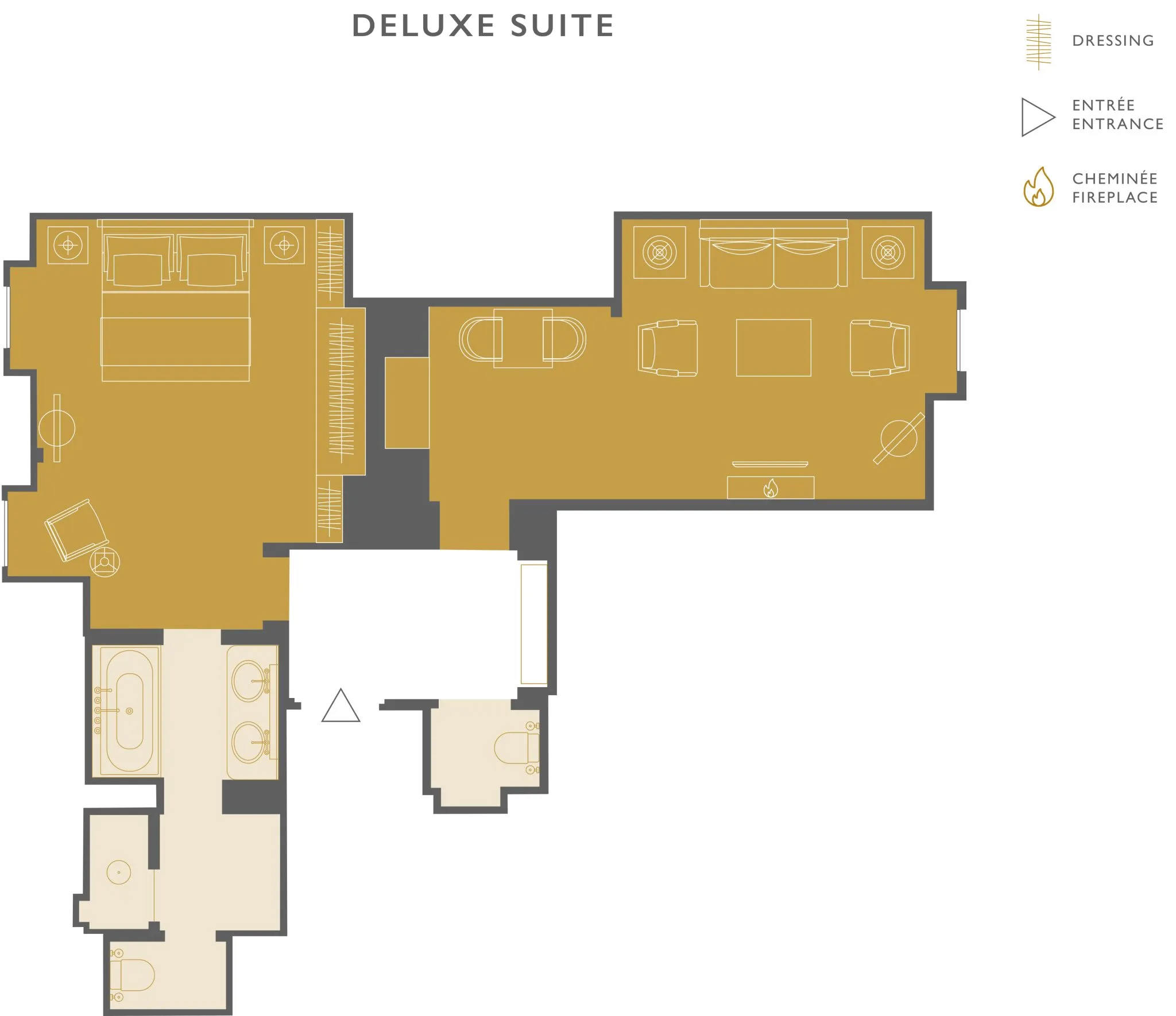 Jede Deluxe Suite empfängt Sie mit einem eleganten Foyer, das von einem Pouenat-Konsolentisch geschmückt wird. Das einladende Schlafzimmer ist mit Intarsienverkleidungen gestaltet, während das Wohnzimmer mit einem Kamin und einer lackierten Bar ausgestattet ist. Genießen Sie den Blick auf den Place Jean-Marteau und den Genfersee.