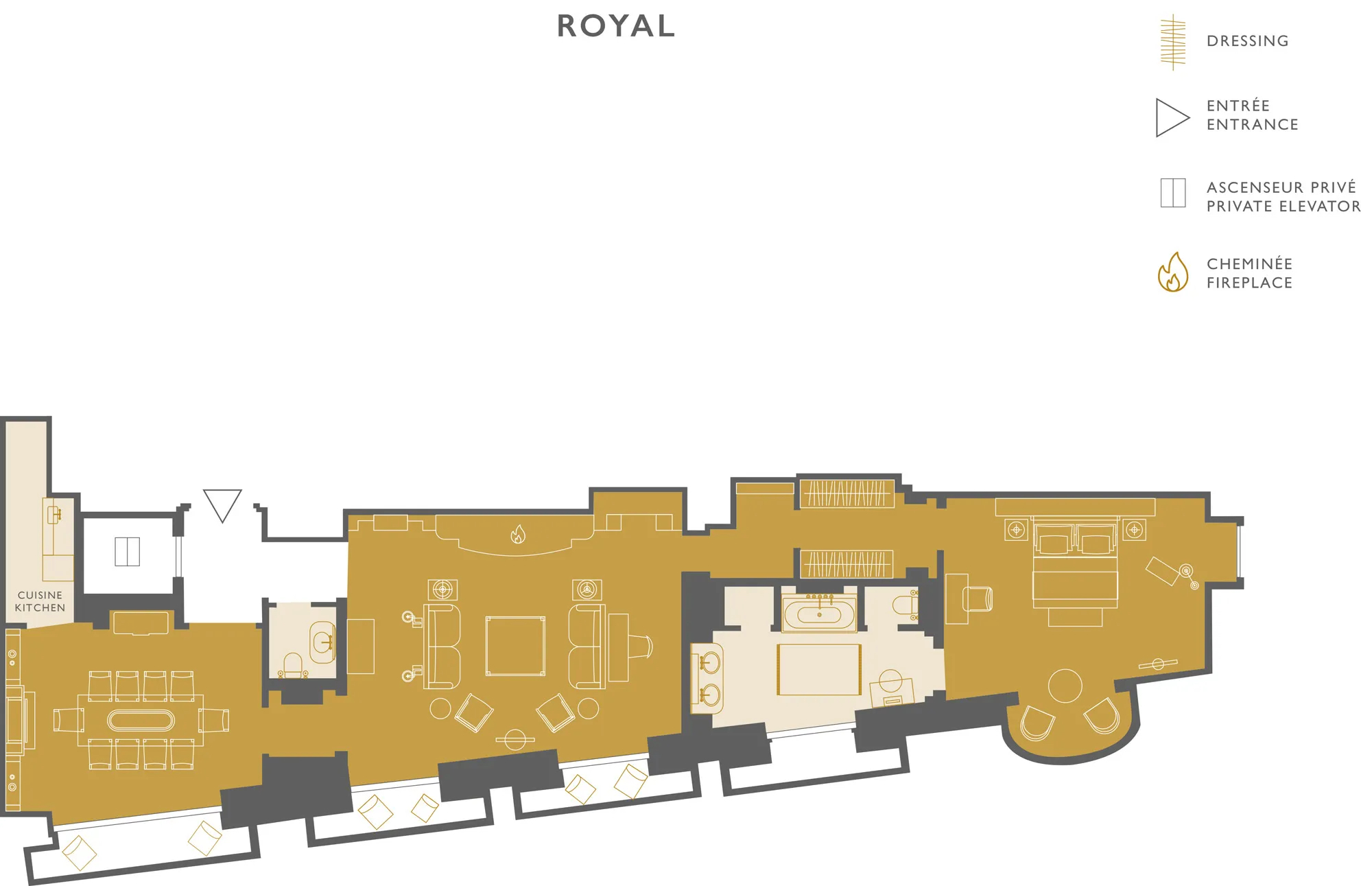 Ein königliches Meisterwerk: Die Royal Suite ist die größte Suite des Hotels und beeindruckt mit privatem Aufzugszugang sowie atemberaubenden Ausblicken auf den Genfersee von allen Bereichen. Das weitläufige Wohnzimmer mit Kamin, großzügigen Sitzgelegenheiten und einem Baccarat-Kronleuchter öffnet sich zu zwei Balkonen und dem privaten Esszimmer für bis zu 10 Personen, das ebenfalls über einen Balkon verfügt. Das Schlafzimmer bietet Blick nach Norden und Westen, einen eleganten Schreibtisch von Nicolas Aubagnac und ein imposantes Badezimmer mit einem vierten, seezugewandten Balkon.