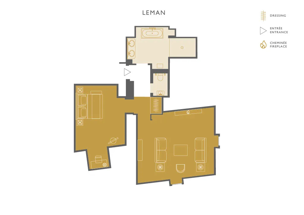 Unter der historischen Kuppel des Hotels befindet sich das großzügige Wohnzimmer der Suite Léman, geschmückt mit einem Baccarat-Kristallkronleuchter und einer lackierten Bar. Genießen Sie den Panoramablick auf den Genfersee. Das Schlafzimmer ist mit zwei Holzschränken und einem Schreibtisch am Fenster ausgestattet. Selbst das lichtdurchflutete Badezimmer bietet einen Teilblick auf den See.
