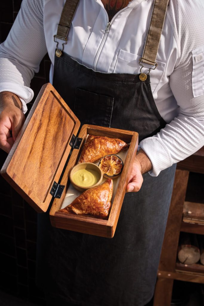 To do so, the chef boils and slow roasts the stingray meat, then shreds it in the style of another beloved Mexican dish, carnitas. Next, he seasons: bay leaves, garlic, Mexican allspice, chile verde, dates, and wild oregano—all of which he forages himself after the rainy season. Finally, he stuffs the melt-in-your-mouth meat into rich dough to bake buttery, golden empanadas. The dish is presented in a carved wooden box with toreado salsa, another product of local sourcing, made with serrano chiles roasted over charcoal and emulsified with olive oil, lemon, and soy sauce.