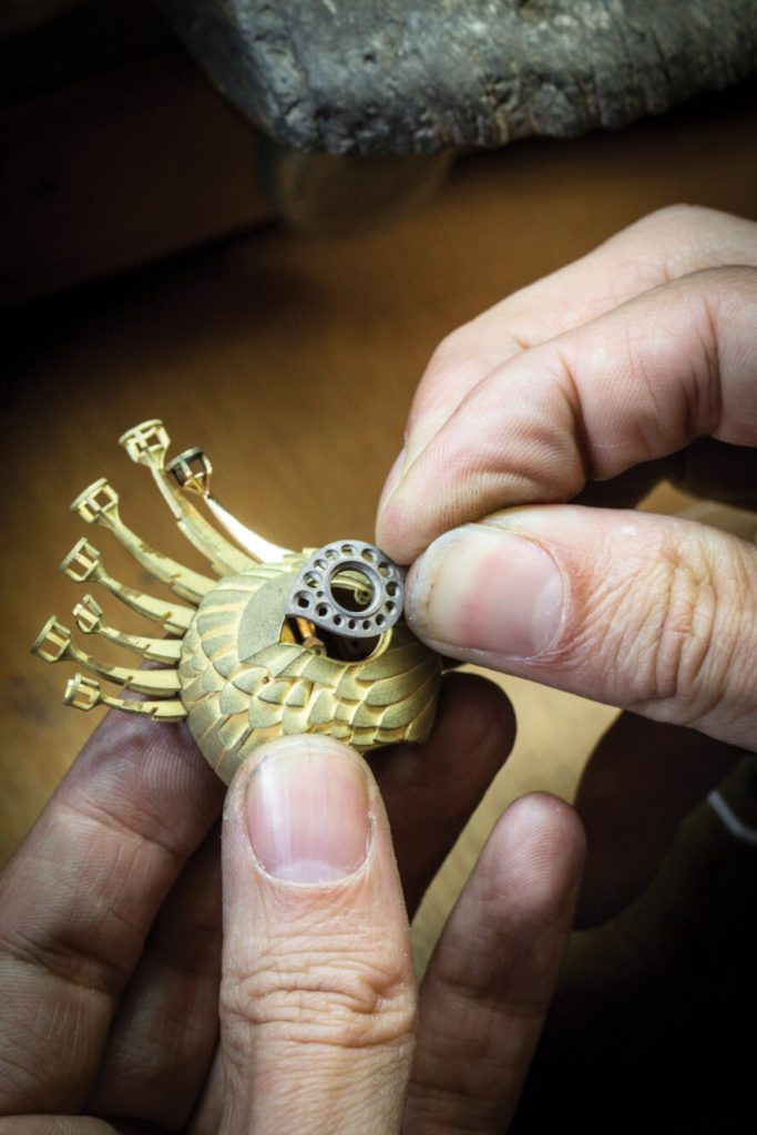 In 2017, Van Cleef & Arpels raised the bar even higher when it unveiled its first-ever large-scale automaton: Fée Ondine, an extraordinary clock topped with an animated bejeweled fairy that took seven years to complete. Since then, the house has continued to develop large-scale automaton clocks, featuring dramatic scenes-in-motion such as blooming flowers and orbiting planets.