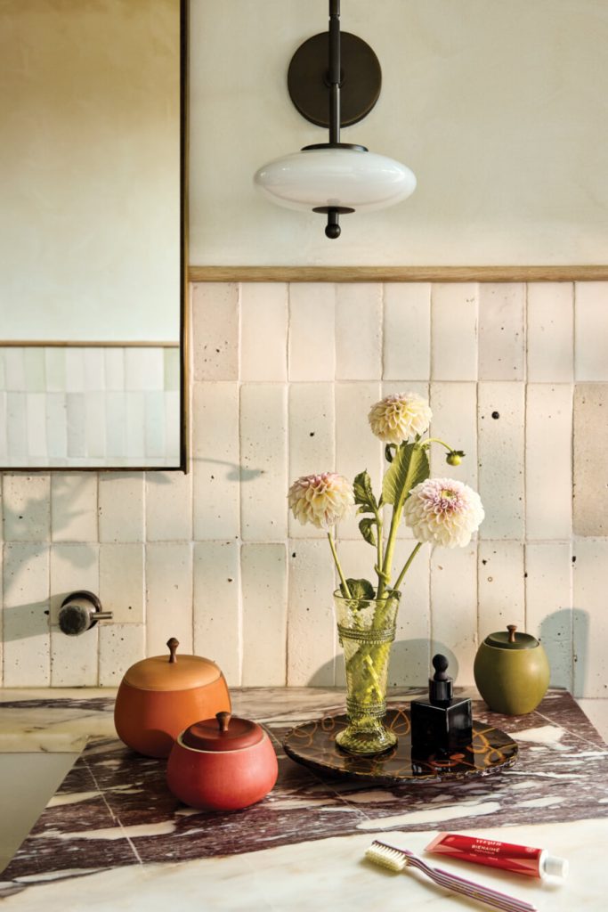 In the Ridge Suite, Matthew Kenney maple wood boxes, Aono Pottery slipware dish, and Bollenglass bud vase.