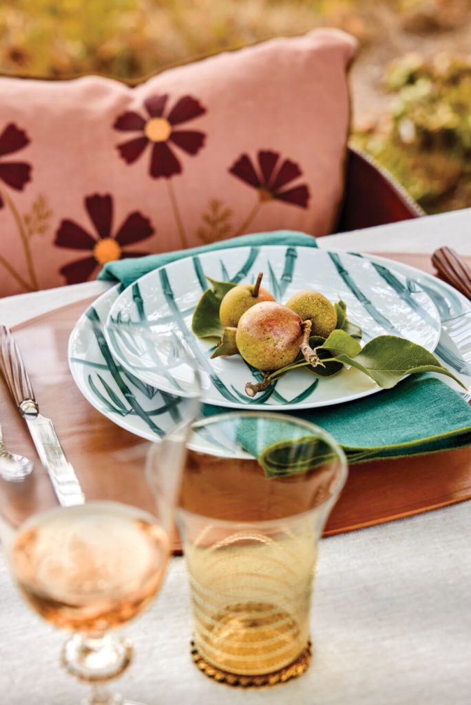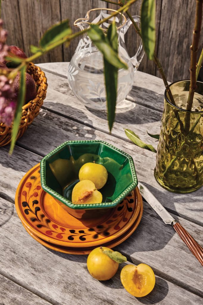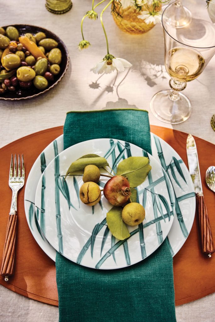 Marie Daage hand-painted porcelain plates, Alain Saint-Joanis rosewood cutlery, Borgo delle Tovaglie napkins, Peter Speliopoulos Projects placemats, and Aono Pottery slipware dish.